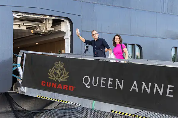 Per Weltreise-Shuttle-Service erreichen Sie die Queen Anne. Mit ihr geht es nun hinaus in die Welt zu neuen Abenteuern.